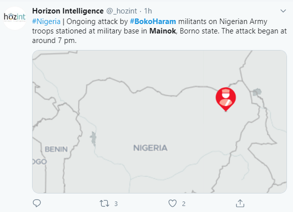 Men of the Nigerian Army stationed in Mainok, Kaga Local Government Area of Borno State, are currently in a gunfight with some Boko Haram insurgents. According to residents, the insurgents entered the village around 7pm, shooting sporadically, and made their way to the military base where shooting has been ongoing for hours as the insurgents fight with the troops. The troops engaging the insurgents are from the army’s 29 battalion task force in Mainok. Sources said villagers are still scampering for safety.